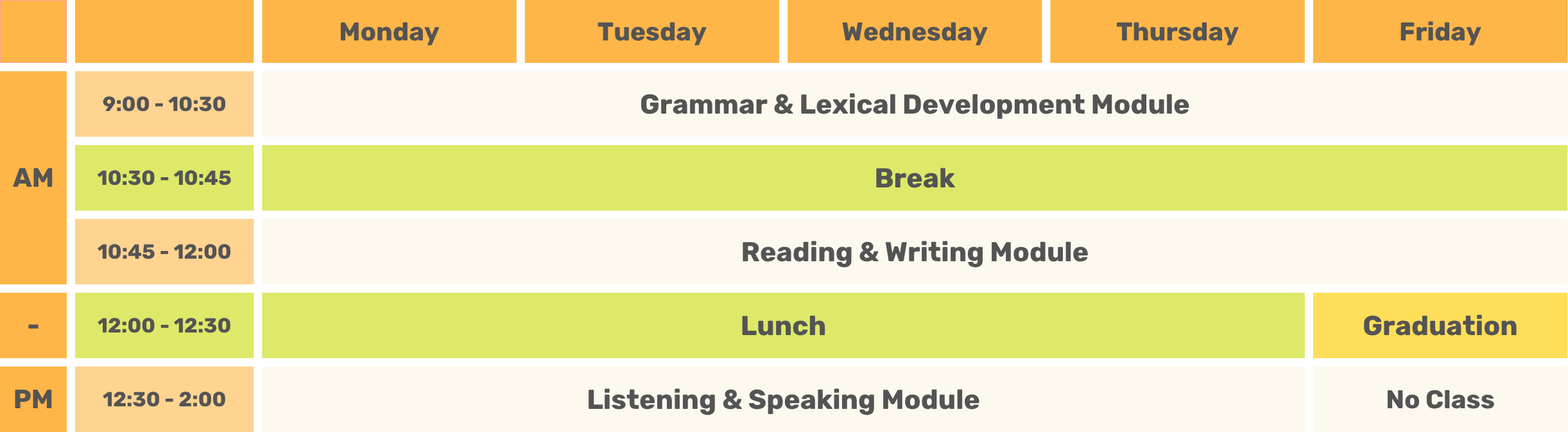 - Morning General English classes with a focus on Grammar, Reading and Writing